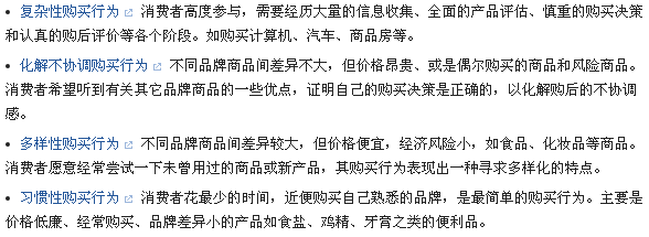 從上面可以見(jiàn)到,我們根據(jù)購(gòu)買者的參與程度和產(chǎn)品品牌差異程度可以區(qū)分出四種購(gòu)買類型: